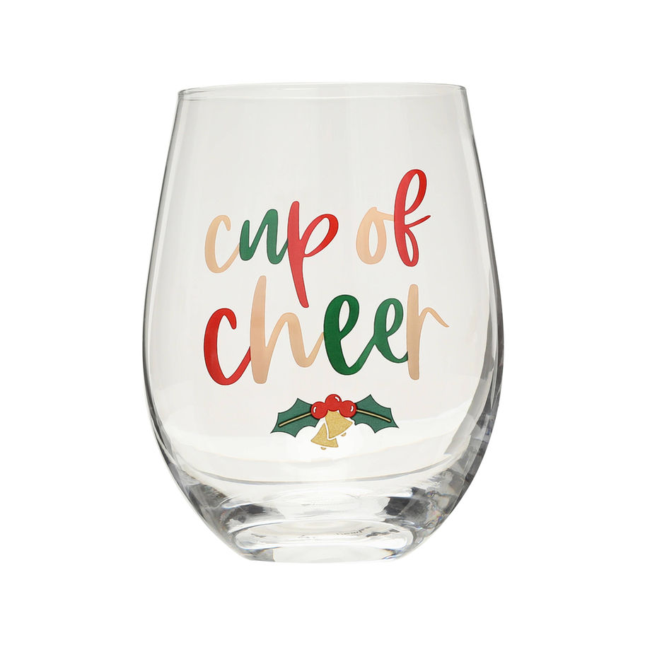 • Includes one stemless wine glass decorated with “cup of cheer” in a colorful, cursive print with festive holiday bells and holly • This wine glass is perfect for celebrating the holidays with friends and family or just enjoying a cozy night in during the chilly weather! Simply add your favorite wine or winter cocktail and enjoy! • This Christmas themed wine glass is the perfect novelty gift, party favor, or holiday gift for friends and family